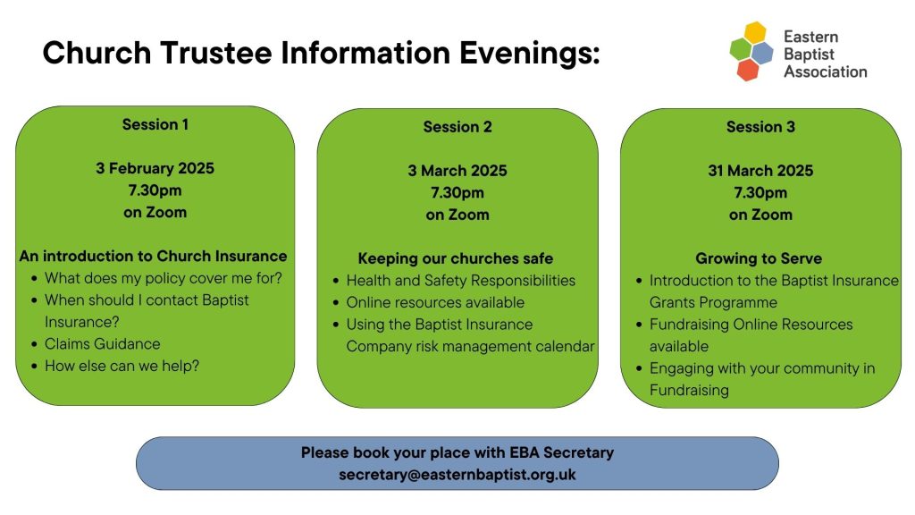 All sessions start at 7.30pm and are on zoom, please email secretary@easternbaptist.org.uk for the zoom details.